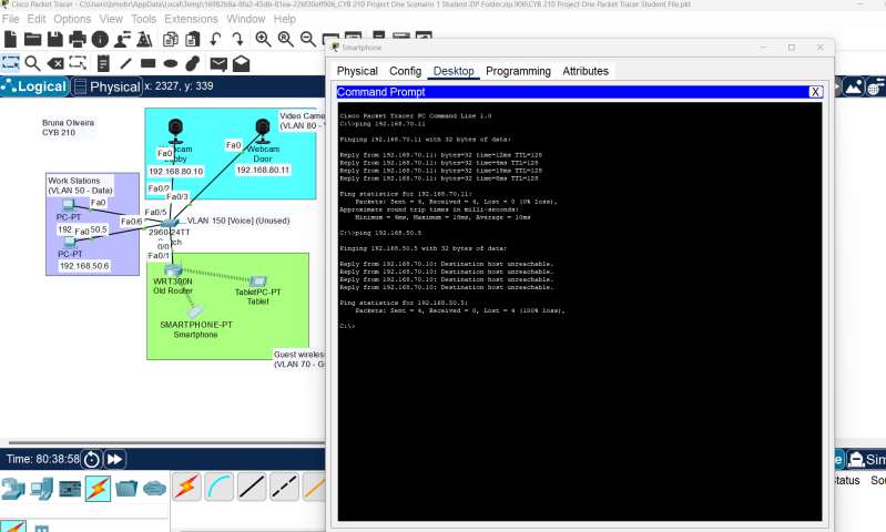Ping Test: Successful Communication Within VLAN 70 (Smartphone)
